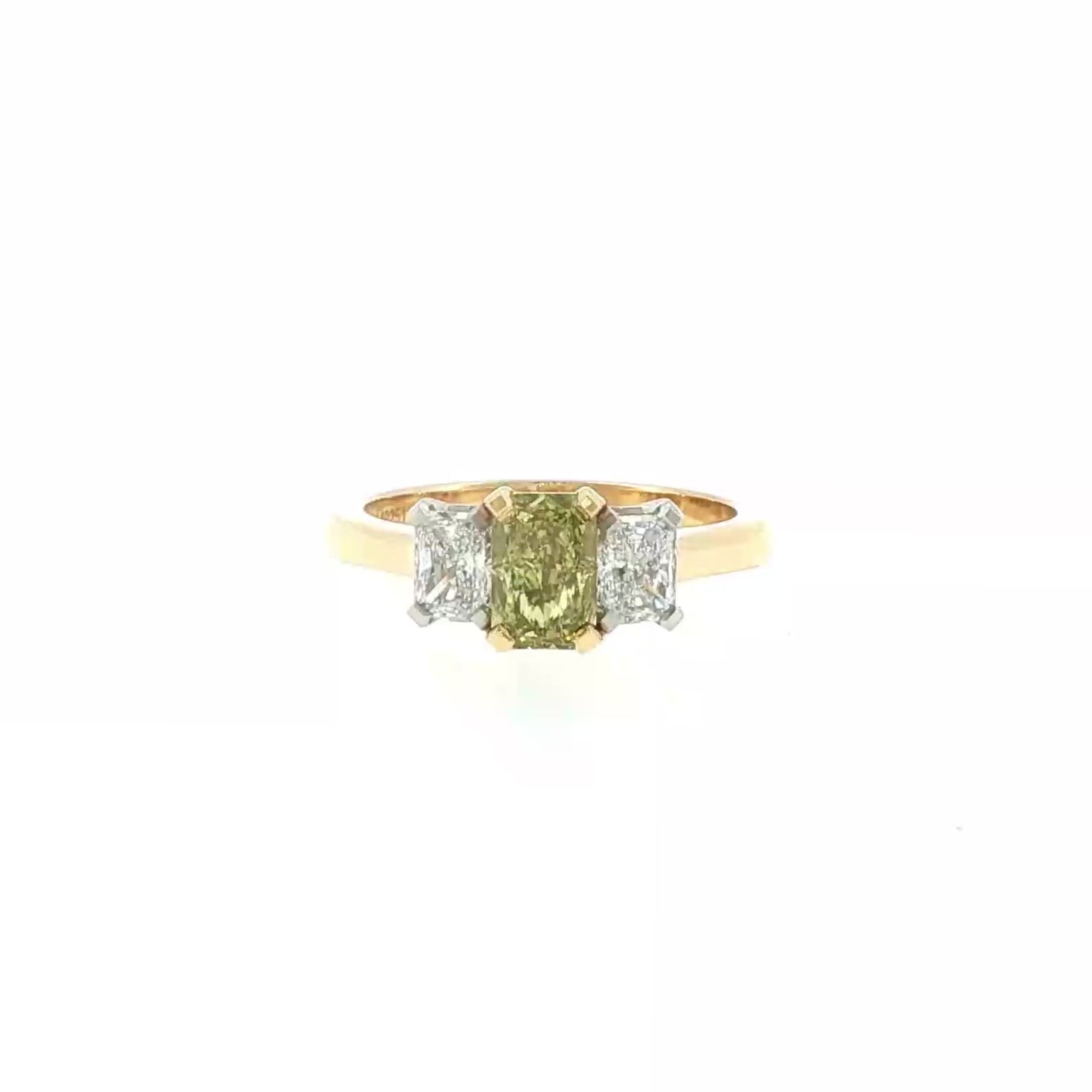 Radiating a rich olive green hue with hints of yellow, this classic three-stone ring is impossible not to fall in love with. A 0.97ct radiant-cut diamond of natural fancy deep greenish-yellow colour takes centre stage. With its high intensity and saturated colour, excellent polish, very good symmetry, and VS1 clarity, this diamond is extremely rare and highly desirable. Only 1 in 10,000 diamonds receives this superb rating.