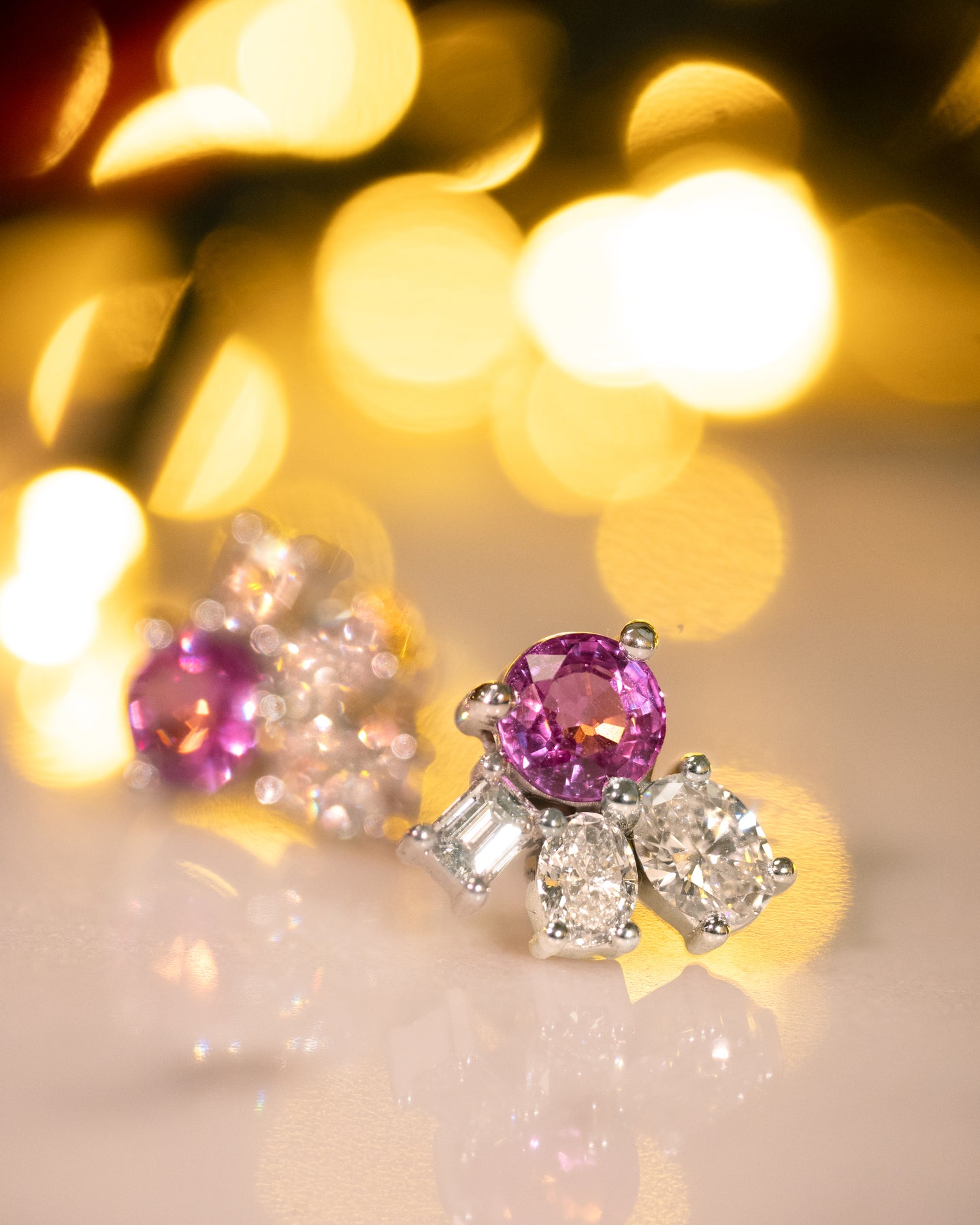 Each earring is crafted in 18ct white gold and features a stunning, round pink sapphire set totalling 1.84ct with mixed cuts of diamonds that total 1.31ct.