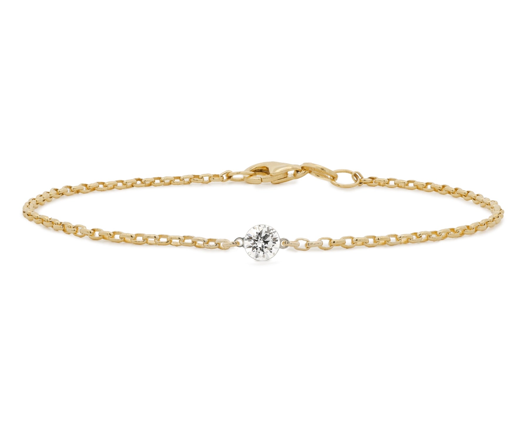 Featuring a 0.27ct patented Floeting® Diamond of G colour and VS2 clarity. The diamond is secured in a scientifically tested setting made using a specialist titanium alloy and paired with platinum. The oval belcher bracelet is crafted from 9ct yellow gold and measures 18.5cm in length.