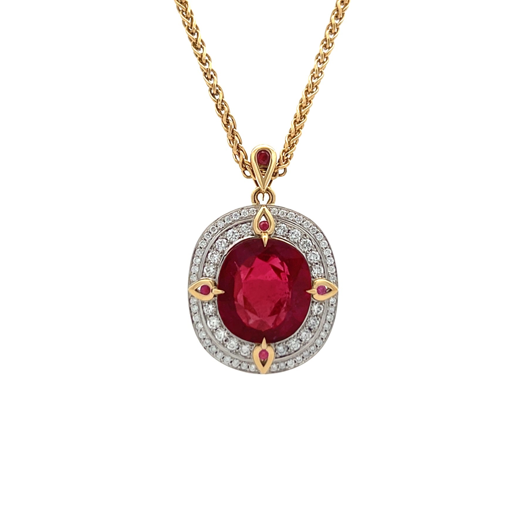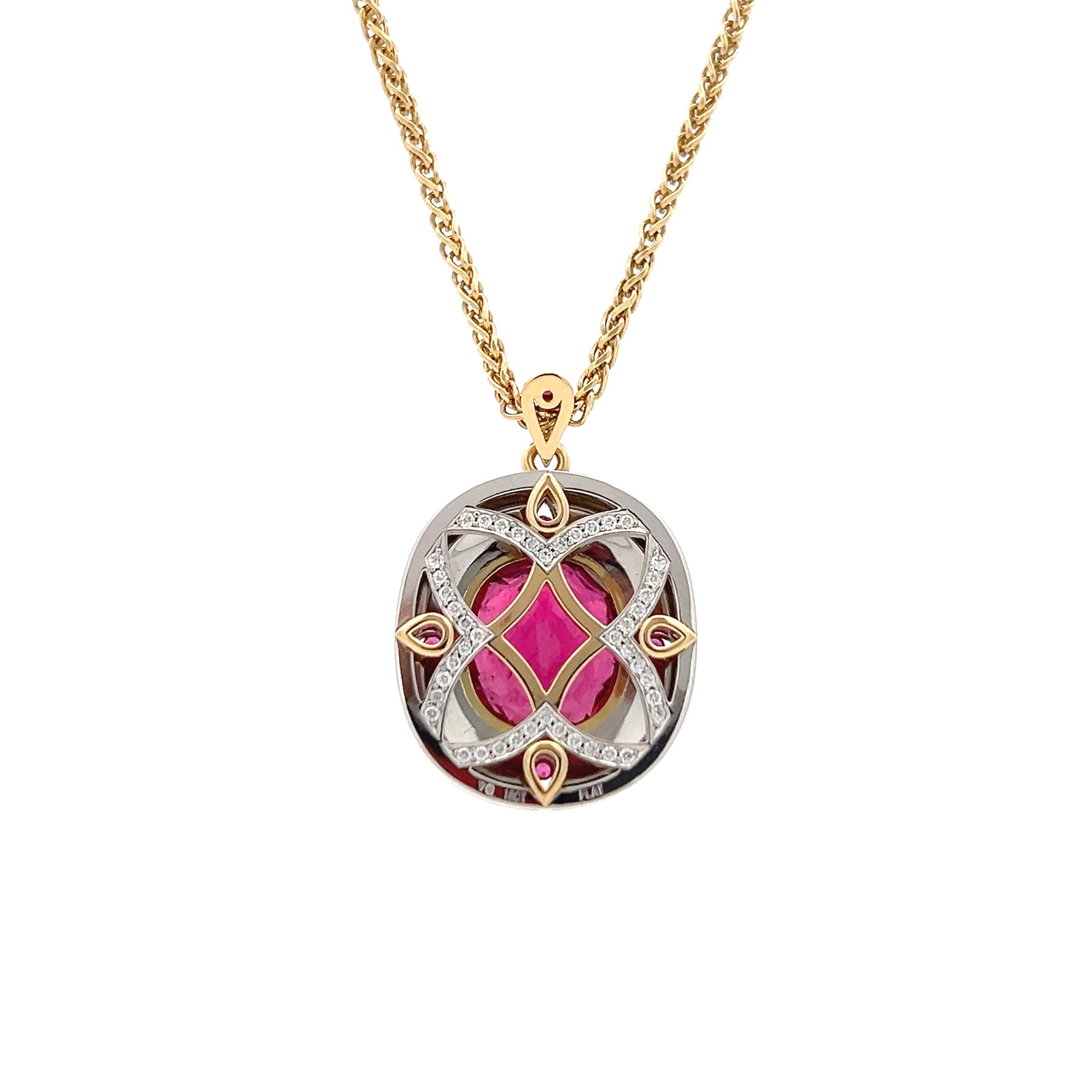 Featuring an 11.36ct oval-cut Rubellite that shimmers with a deep crimson hue, it is adorned with a double diamond halo set in platinum. Five pear-cut rubies, luxuriously wrapped in 18ct yellow gold, beautifully complement the exquisite centre gem, like stars guiding us through the night. On the reverse, a platinum quatrefoil embellished with diamonds adds a touch of sparkle for the discerning jewellery lovers.