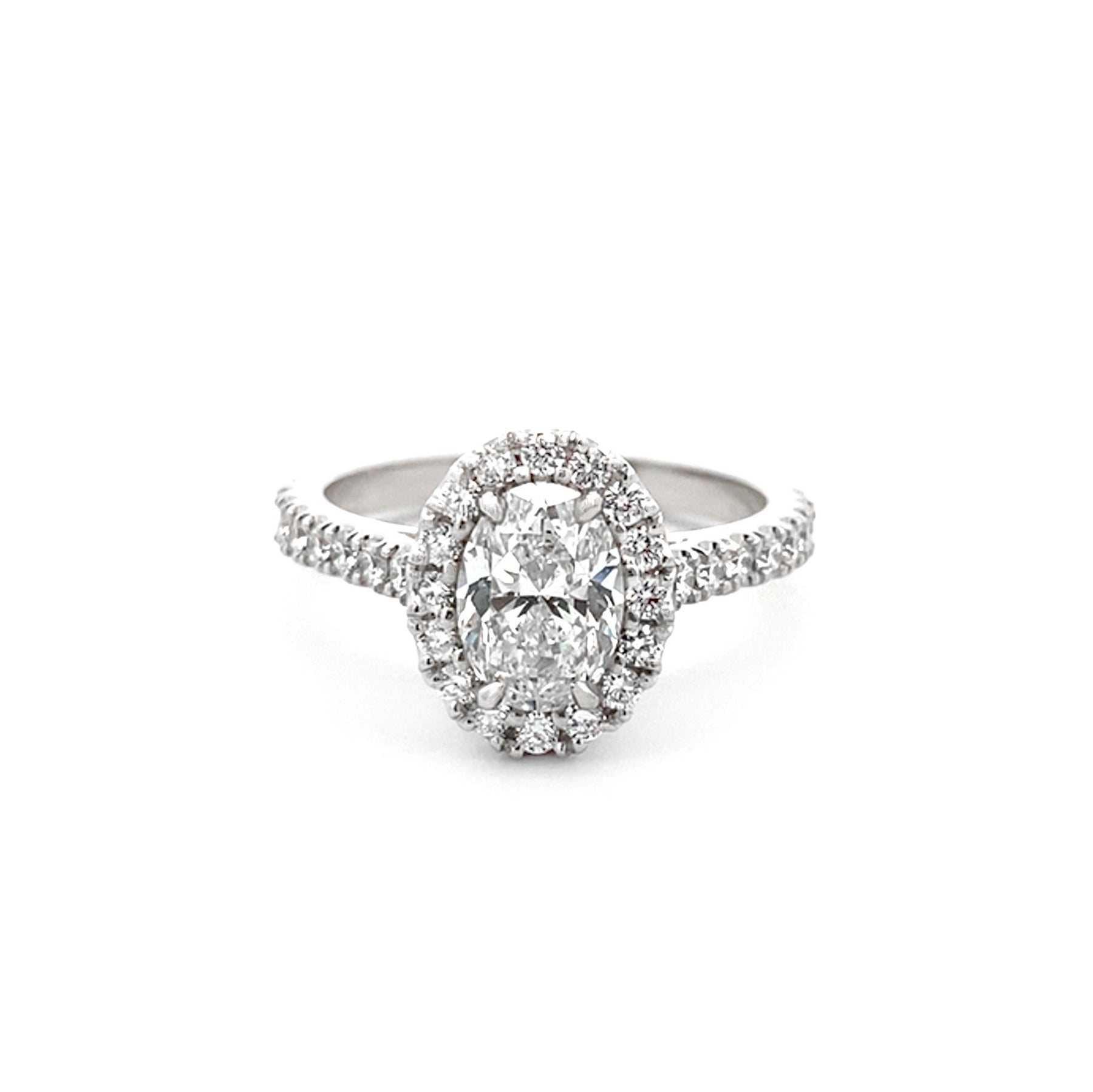 A classic design adorned with scintillating round brilliant cut diamonds haloing the centre oval cut diamond and flowing down the band, wrapping the finger with a little extra sparkle. This ring is crafted in platinum and features a 1.20ct oval cut centre diamond of G colour with SI1 clarity, certified by GIA, surrounded by 16 round brilliant cut diamonds in the halo, and 16 round brilliant cut diamonds scallop set into the band together totalling 0.54ct of D-G colour, VS1-SI1 clarity.