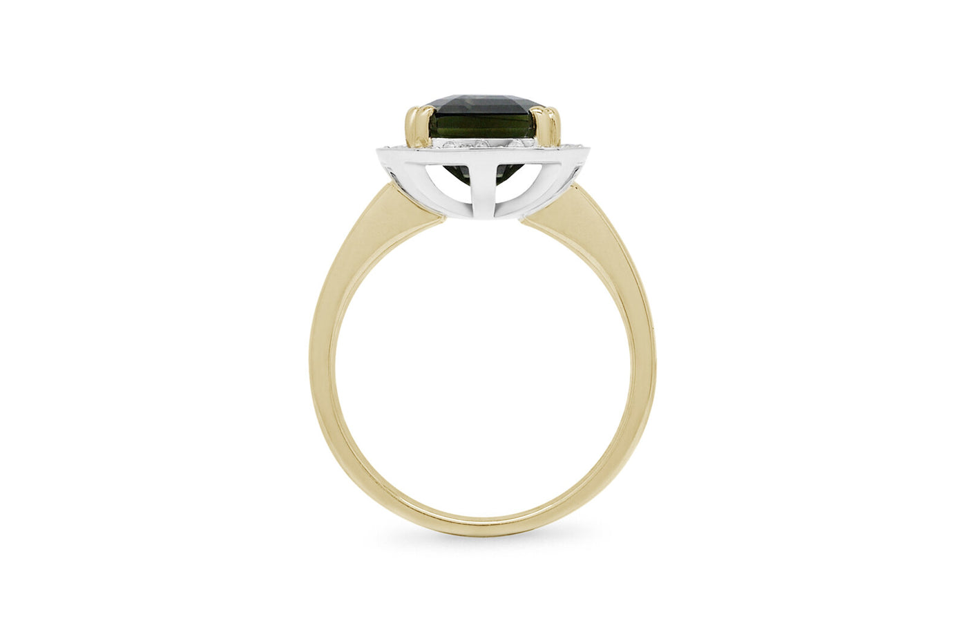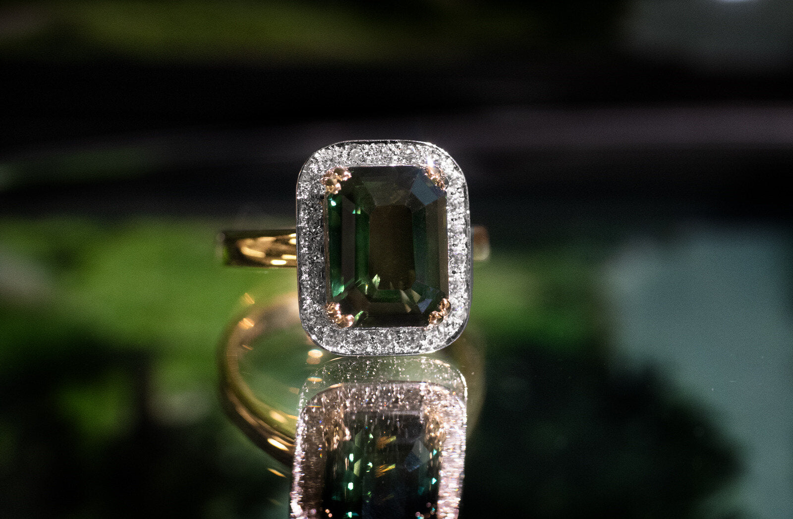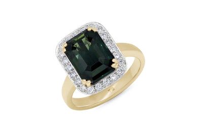 The deep green sapphire in the Almost Midnight ring glimmers with a captivating green hue, hinting at the untold secrets and tales of the night yet to unfold... Featuring a stunning 6.29ct emerald cut green sapphire, this beautiful ring design is sure to make you the belle of the ball. Held by yellow gold double prongs and framed in 22 diamonds with a total weight of 0.374ct, F-G colour, SI clarity. This gorgeous halo ring design is sure to stand out and take the spotlight. Carefully crafted in 18ct yellow gold and platinum in our on-site Wellington jewellery workshop.