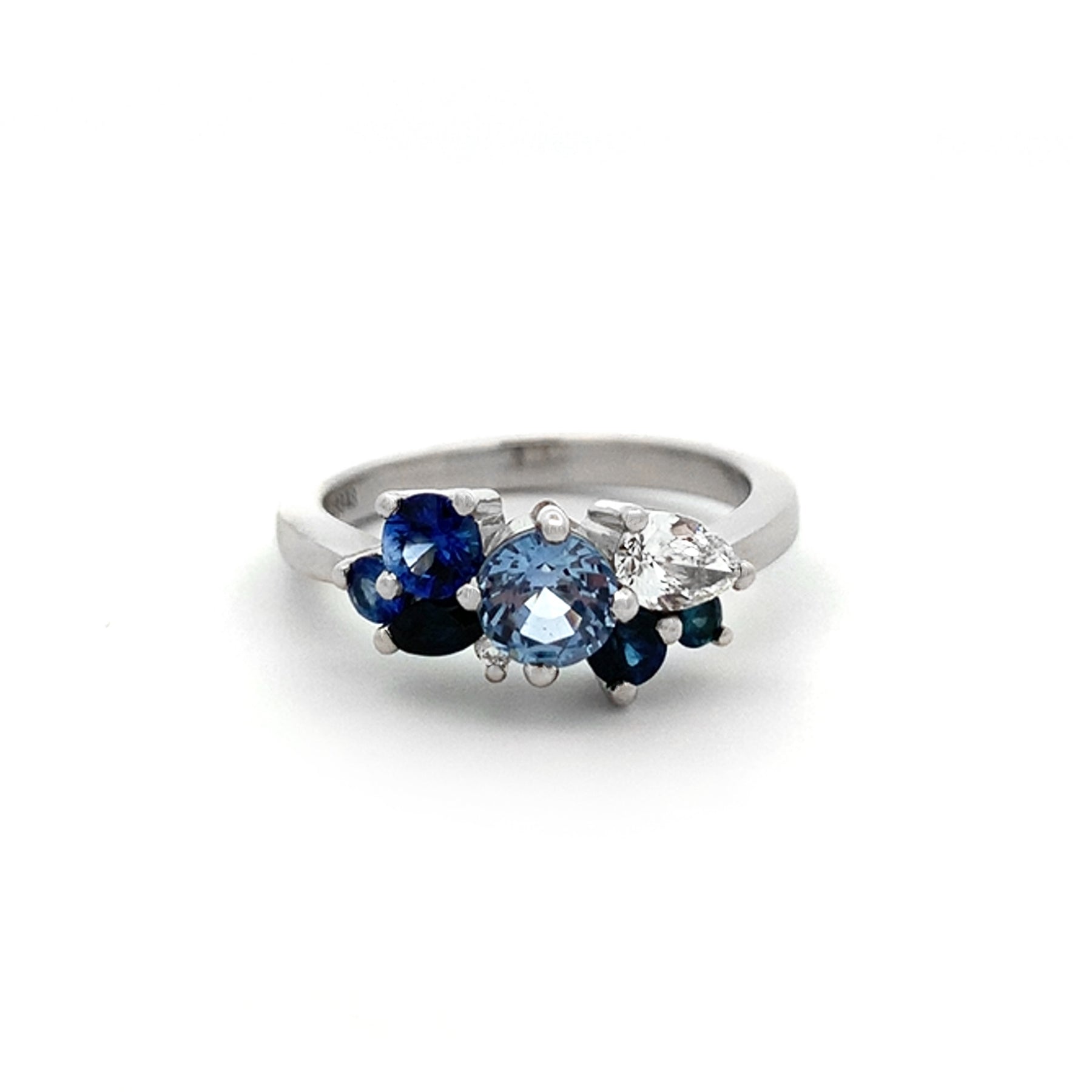 The enchanted forest is filled with delights. Crafted in lustrous platinum, this gorgeous ring features a 0.62ct central round sapphire, one 0.21ct pear cut diamond, one 0.21ct round blue sapphire, one 0.12ct sapphire, two 2mm blue sapphires, and one 1.5mm round diamond.