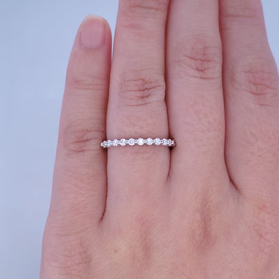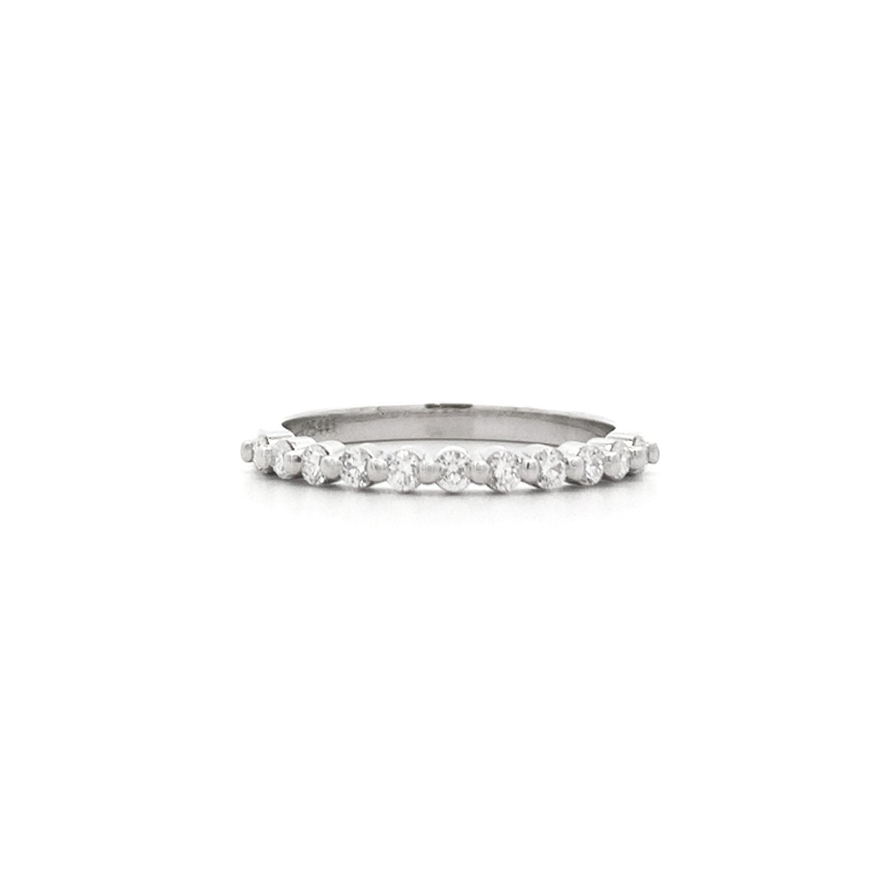 Classic and understated, this elegant diamond ring is crafted in platinum and features 11 round brilliant cut diamonds delicately arranged across the finger. The diamonds are of D-G colour and VS-SI clarity, totalling 0.27cts. The ring is stunning worn on its own or paired with a wide range of engagement ring styles.