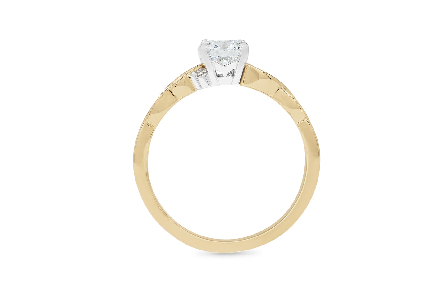 Diamond Solitaire, Diamond Engagement Ring, Engagement Ring, Cara, Narrative Collection, 18k, 18ct, Yellow Gold, Platinum setting, side diamonds, ring design, specialist, Maori, Polynesian, Celtic, jewellery, jewelry, side view, details
