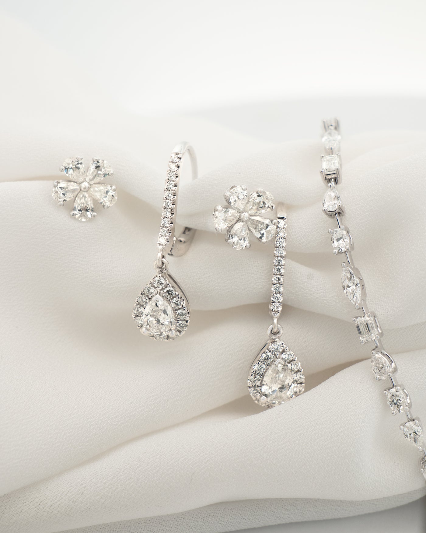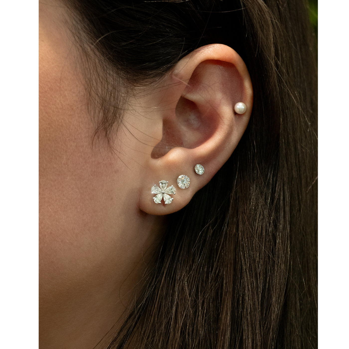 Flower Petal Diamond Stud Earrings in White Gold with 1.24ctw paired with Floeting® Diamond Stud Earrings