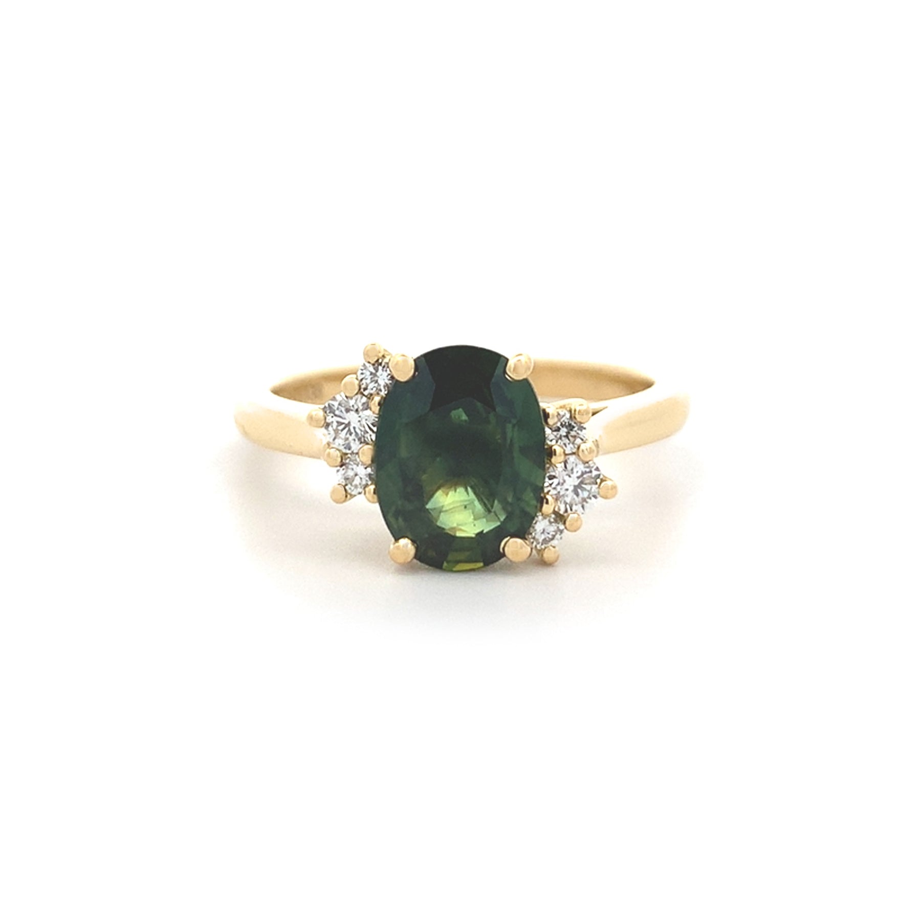 This enchanting cluster ring has a gorgeous warm glow. Crafted in 18ct yellow gold, this ring features a stunning 1.77ct green sapphire with 6 brilliant cut diamonds surrounding the centre gem in a unique off-centre setting. The diamonds have a total weight of 0.15ct.