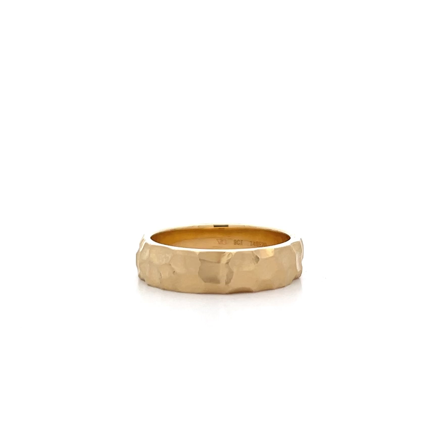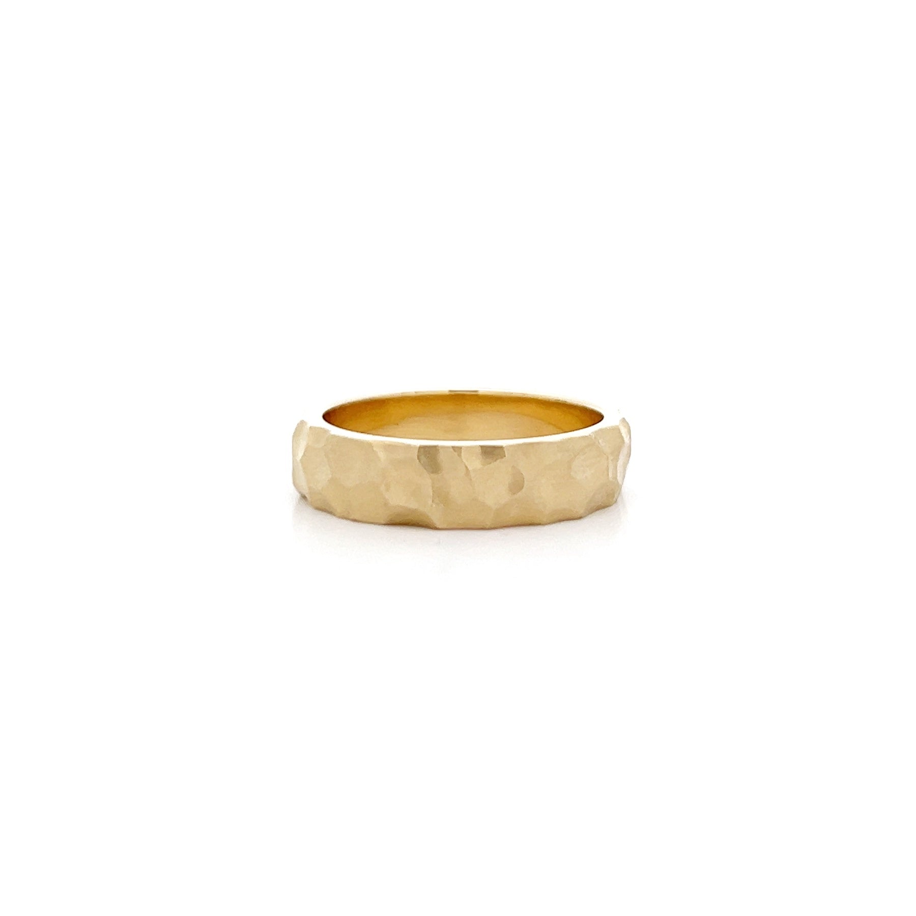 Handcrafted in 9ct yellow gold, this wedding band features a hammered finish, offering an organic look. It measures 5.6mm in width, and 2mm in depth.