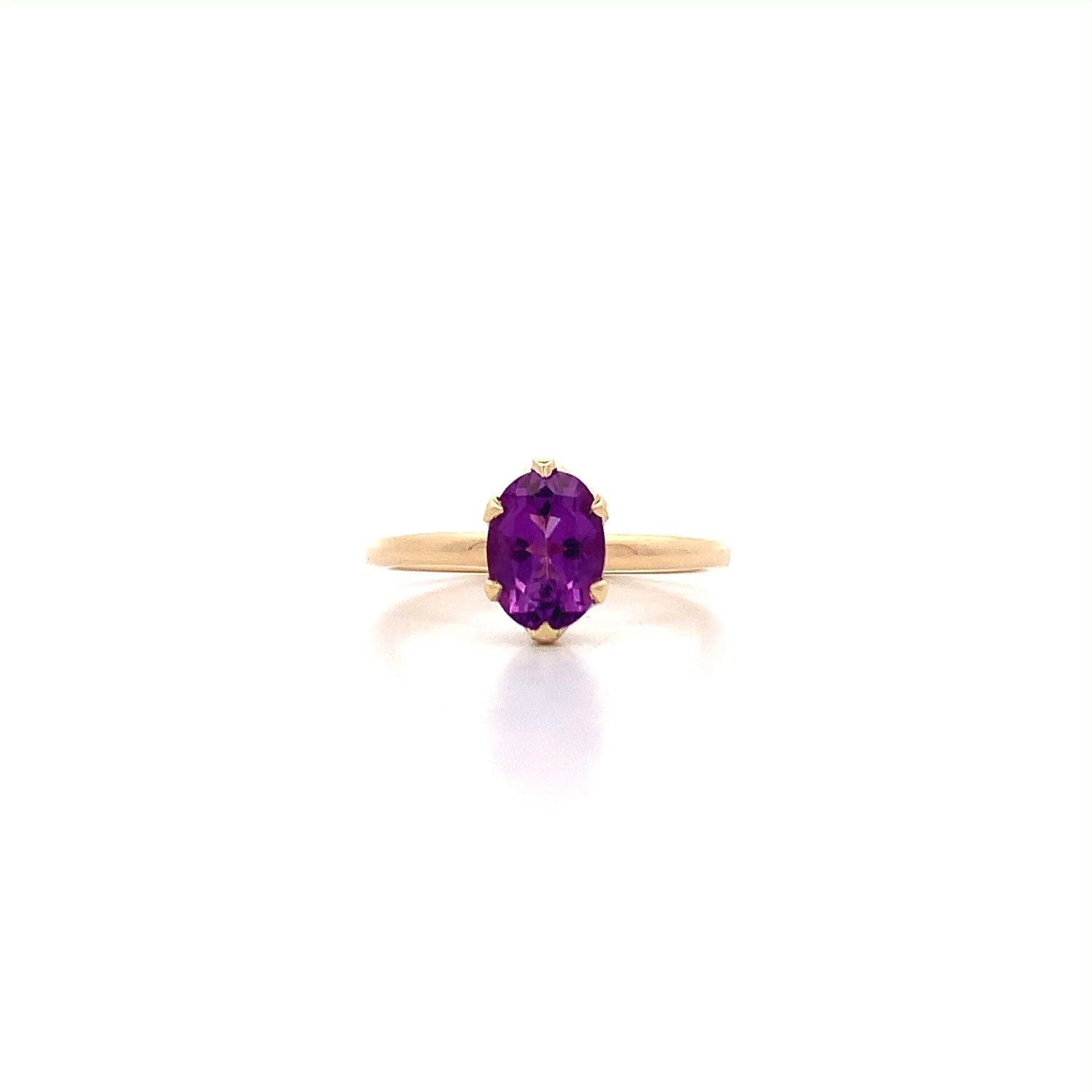 Hand-crafted in 9ct yellow gold, this ring features a 1.21ct oval cut amethyst secured in a six-claw setting.