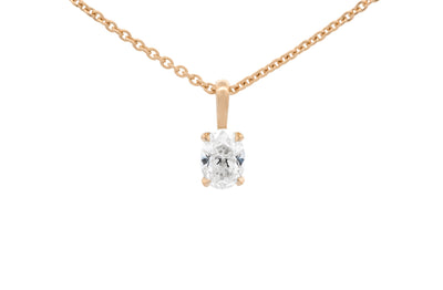 Classic and timeless, this diamond solitaire pendant embraces the oval cut diamond in a four-claw setting. The classic diamond solitaire pendant is available from a 0.40ct centre diamond and can be crafted in platinum or 18ct yellow, rose or white gold.