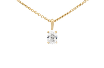 The pendant pictured is crafted in 18ct yellow gold featuring a 0.42ct oval cut diamond. The chain measures 45cm in length and will match your chosen precious metal option.