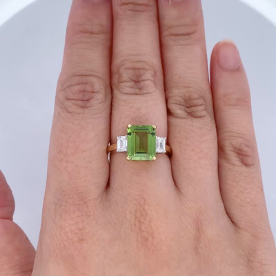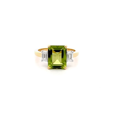 Crafted in 18ct yellow gold and platinum, this beautiful dress ring features a 3.29ct octagonal cut peridot accentuated with two emerald cut diamonds of D-G colour and VS2 clarity, totalling 0.61ct.