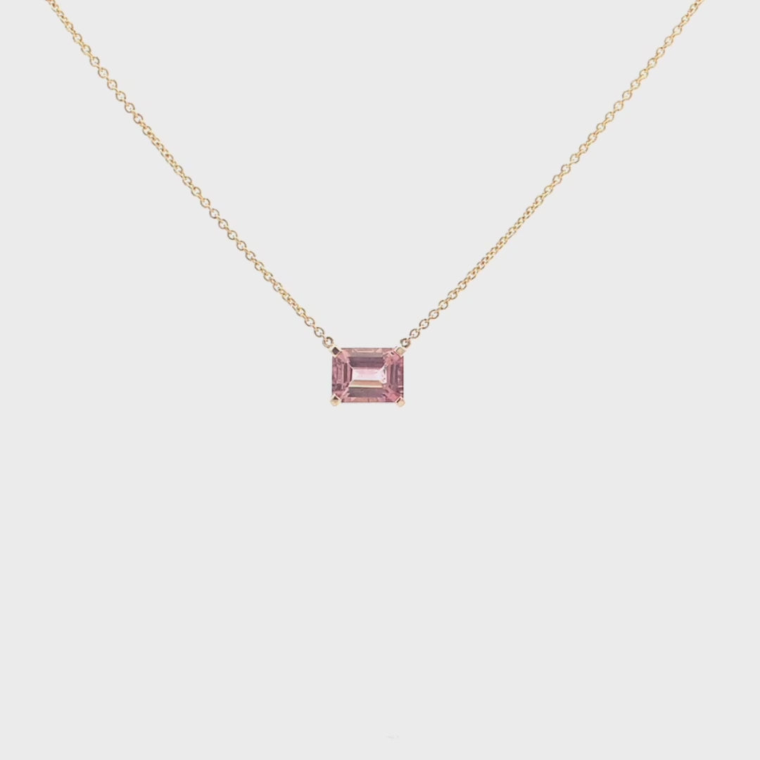 Crafted in 9ct yellow gold, this beautiful pendant secures a 1.70ct emerald cut pink tourmaline in a four claw setting. This pendant comes in a 45cm chain in 9ct yellow gold.