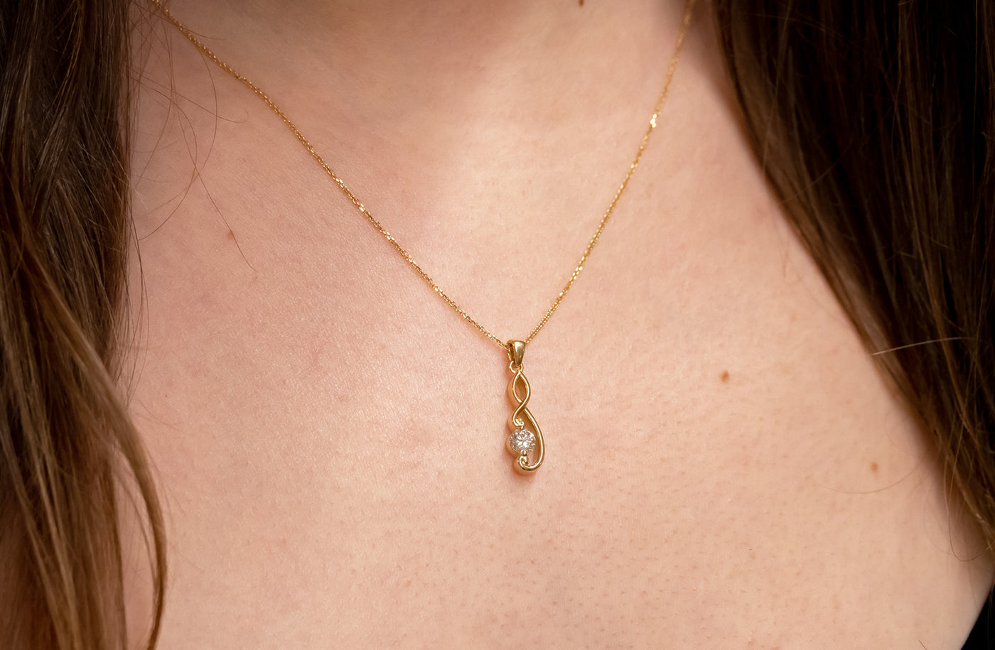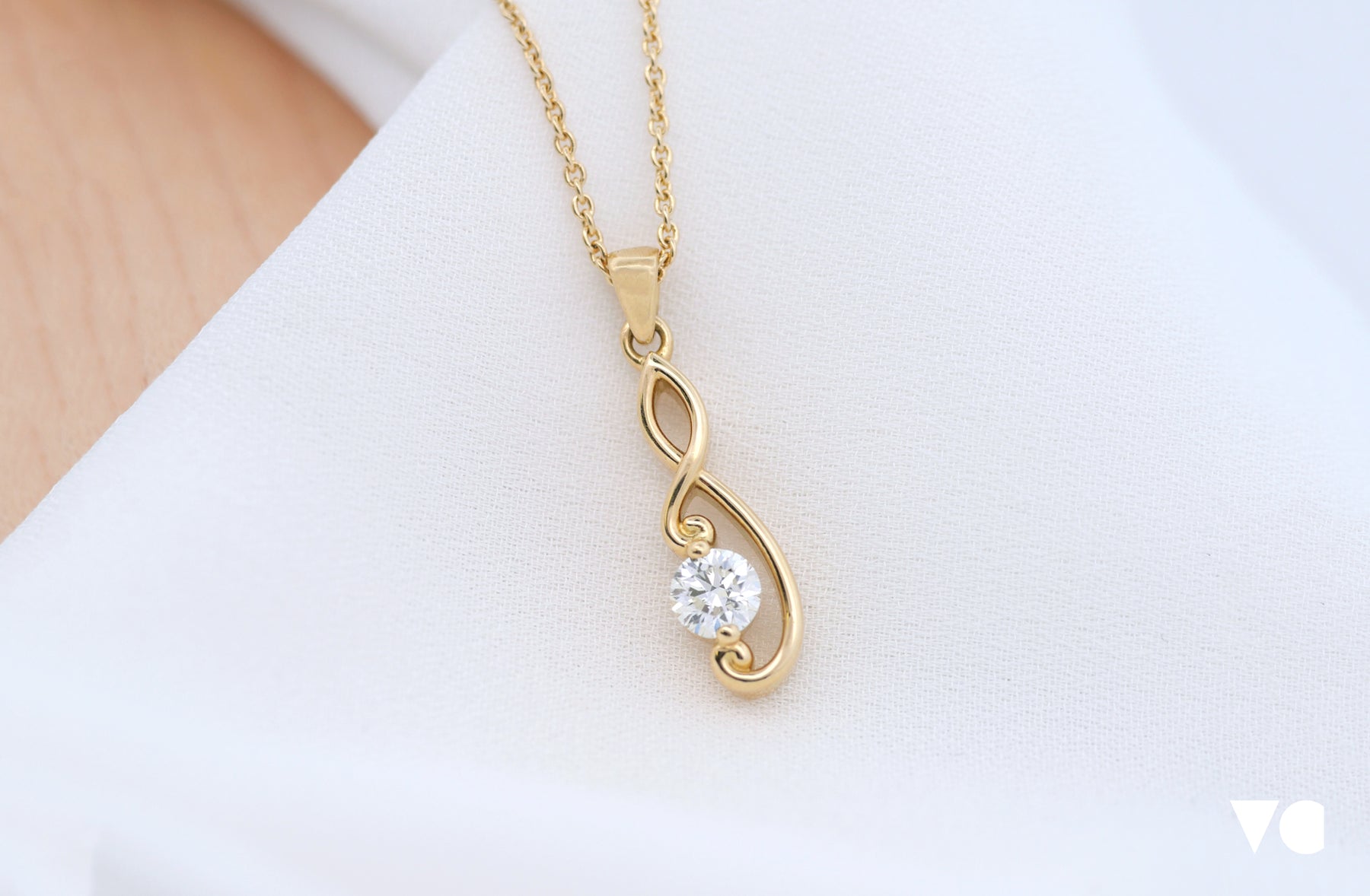 This pendant starts from using a 0.30ct centre diamond, the pendant pictured on model is crafted in 18ct yellow gold and features a 0.32ct centre diamond. Supplied with a chain crafted from the same metal as pendant and measures 45cm.