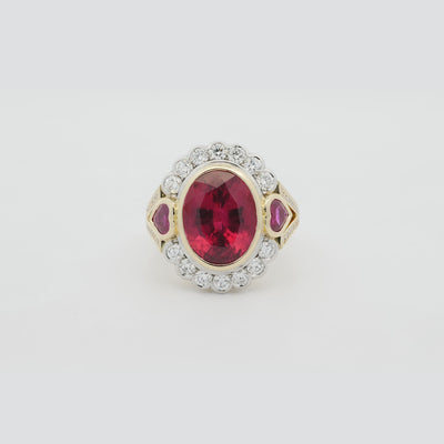 This stunning piece showcases a breathtaking 7.29 ct oval rubellite at its heart. The gem is embraced by a halo of 14 brilliant-cut diamonds, enhancing its allure. Two captivating heart-cut rubies adorn its sides to complete the picture.