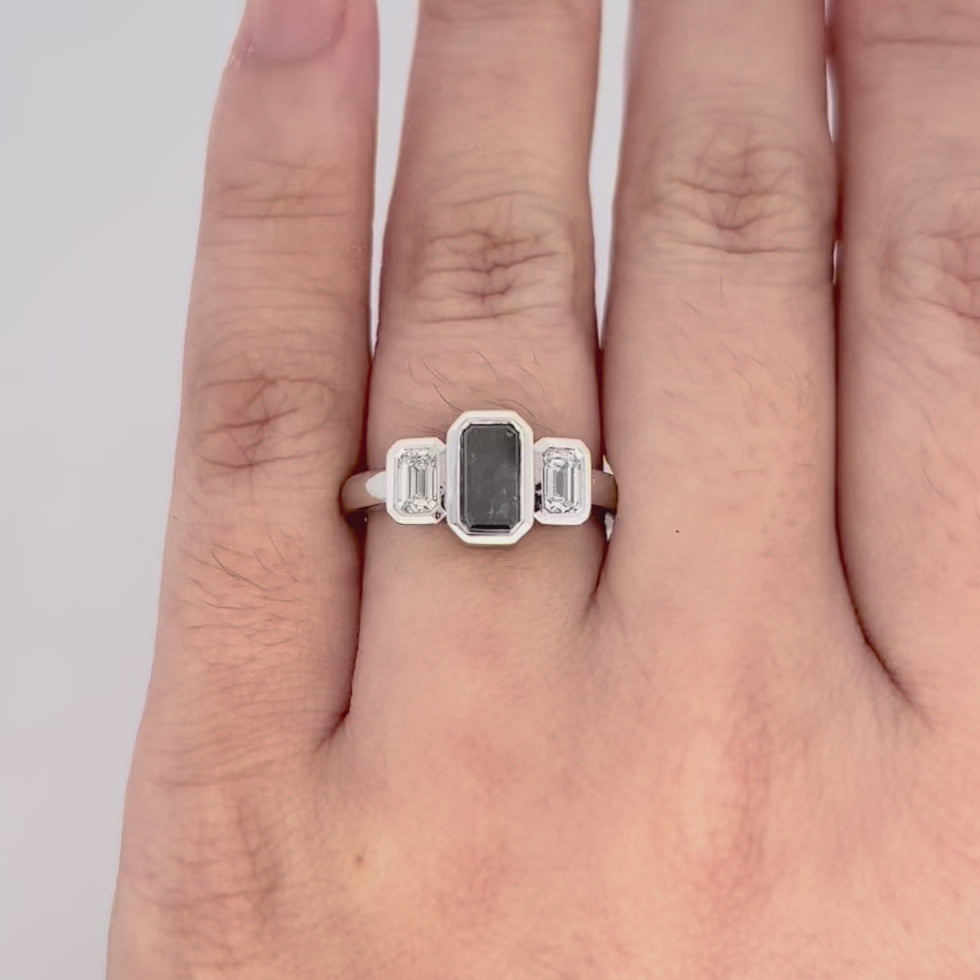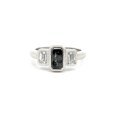 Handcrafted by Darren, our master jeweller, this classic three-stone design features a 1.13ct emerald cut salt and pepper diamond and two emerald cut white diamonds of G colour and VVS clarity, totalling 0.64ct, in a platinum bezel setting.